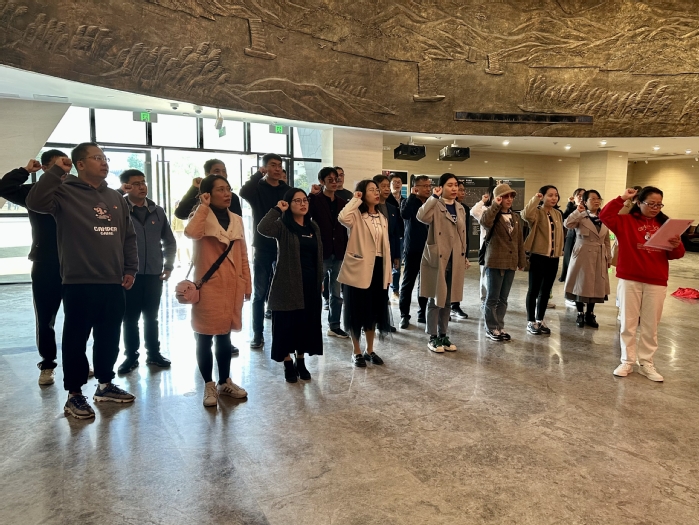 参观后,在展览馆中厅,面向党旗,学院党委书记朱建群记带领党员教师,重温入党誓词。全体党员高举右手,庄严宣誓,醒目的誓词凝聚起不忘初心的信念和力量。