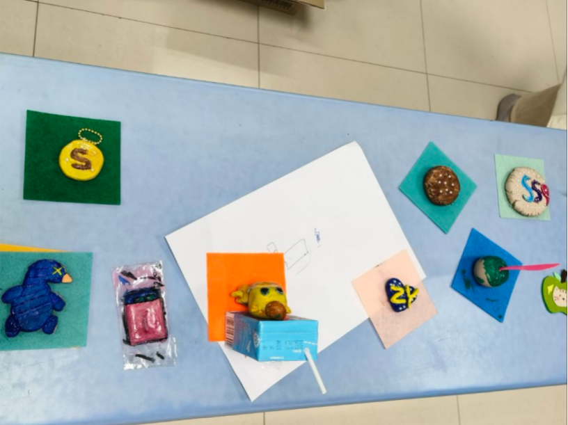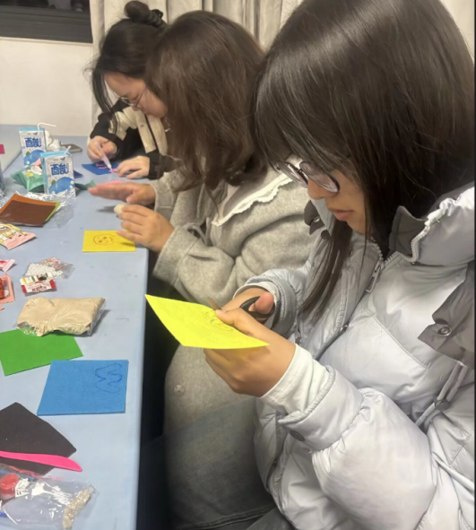 集体DIY“不织布/黏土姓名牌”环节成为全场人气焦点。同学们围坐在一起,手持不织布、黏土等材料,充分发挥创意与动手能力,精心制作专属姓名牌。有的同学融入校园风景元素,有的结合专业特色设计图案,还有的搭配可爱的卡通形象,一个个独具个性的姓名牌在指尖逐渐成型。大家相互交流制作技巧,分享创意灵感,现场洋溢着浓厚的创作氛围,每一件作品都承载着同学们的巧思与热爱。