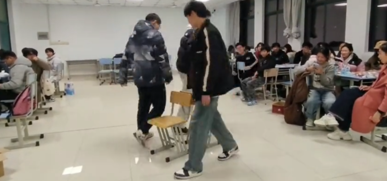 “抢椅子”游戏将活动氛围推向高潮。同学们随着欢快的音乐顺时针转圈,眼神紧盯着椅子,时刻做好抢占准备。音乐骤停的瞬间,大家迅速俯身落座,未抢到椅子的同学幽默退场,现场掌声与笑声不断。随后的“猜歌名”环节,经典歌曲前奏响起,同学们瞬间化身“中华小曲库”,准确猜歌名、接唱歌词,展现出丰富的音乐储备,欢快的旋律回荡在教室的每个角落。