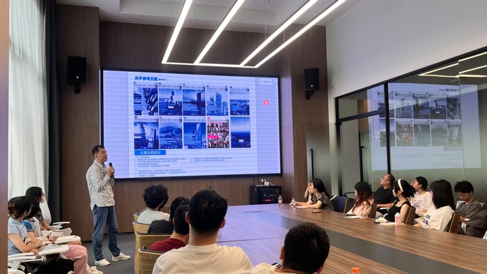 9月19日,建筑学系将《建筑设计整合Ⅳ》课堂搬进合作设计企业。赵刚以“超高层建筑设计整合”为主题,结合大量实际案例,系统讲解了结构选型、机电系统、消防疏散等综合设计要点,直接回应了学生课程设计中的难点。