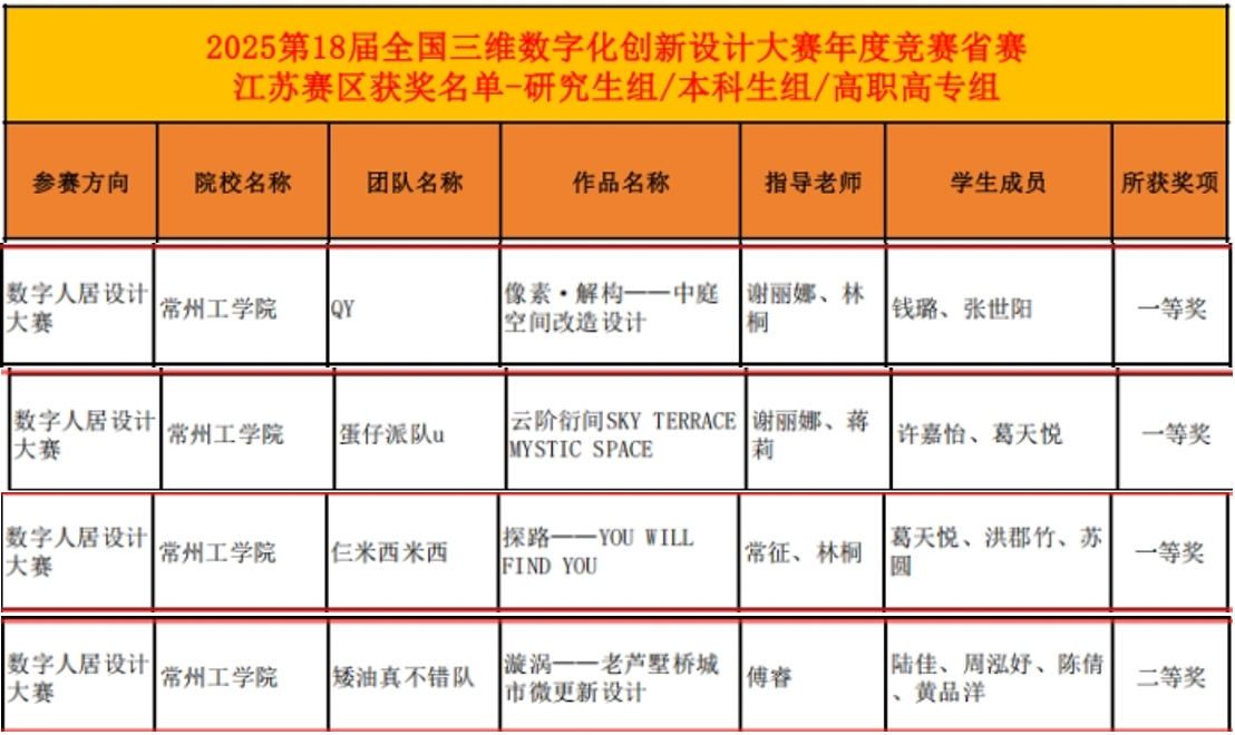 其中,由钱璐、张世阳同学完成,谢丽娜、林桐老师指导的作品《像素·解构——中庭空间改造设计;由许嘉怡、葛天悦同学完成,谢丽娜、蒋莉老师指导的作品《云阶衍间SKY TERRACE MYSTIC SPACE》;由葛天悦、洪郡竹、苏圆同学完成,常征、林桐老师指导的作品《探路——YOU WILL FIND YOU》同时荣获省赛一等奖。由陆佳、周泓妤、陈倩、黄品洋同学完成,傅睿老师指导的作品《漩涡——老芦墅桥城市微更新设计》荣获省赛二等奖。